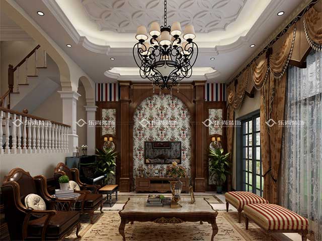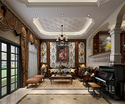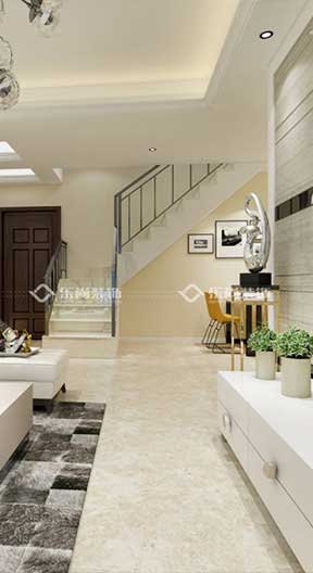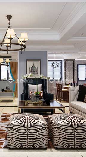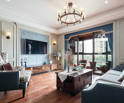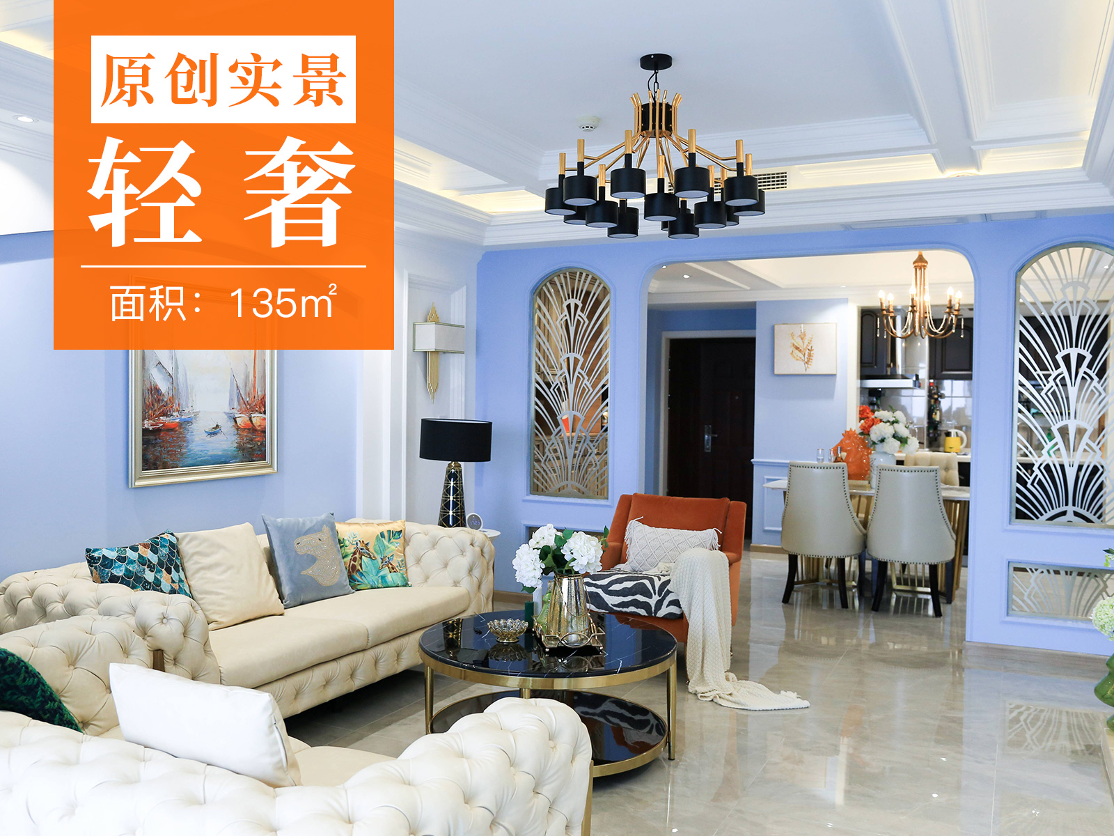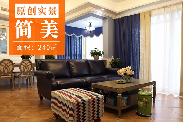 240㎡顶跃美式风格洋房设计,整体以雾霾蓝为主基调,营造出温馨舒适的空间氛围。客餐厅以及玄关地面通体铺装淡暖色瓷砖,让空间氛围中融入自然、温馨、舒适、内敛的设计元素,得以体现出屋主的生活品味。